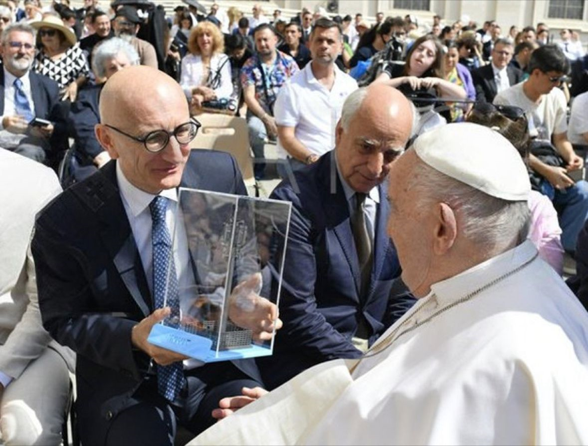 Il nostro Direttore Generale, Diego Galli, ha avuto il privilegio di omaggiare il Pontefice con un oggetto simbolico: il modellino in scala di una delle nostre torri di telecomunicazioni, un omaggio emblematico del valore delle infrastrutture di telecomunicazioni digitali e condivise a beneficio delle comunità e dei territori, che contribuiscono a garantire una maggiore inclusione sociale anche nelle aree in digita ldivide.