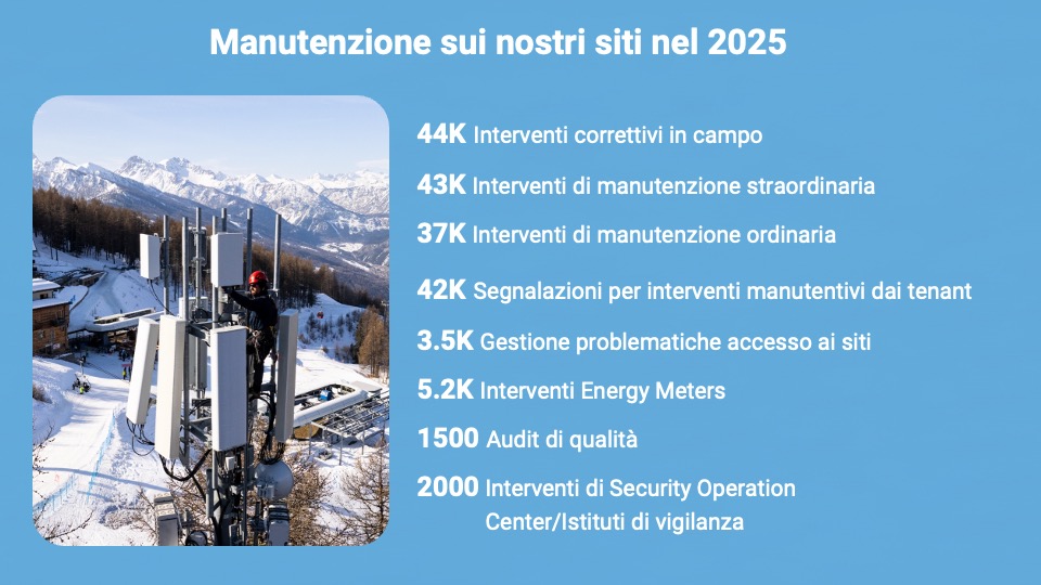 Garantire il funzionamento quotidiano di oltre 25mila torri di telecomunicazione mobili e più di 700 coperture dedicate indoor DAS (Distributed Antenna System) in tutta Italia è una sfida che richiede organizzazione, tecnologia e controllo costante.